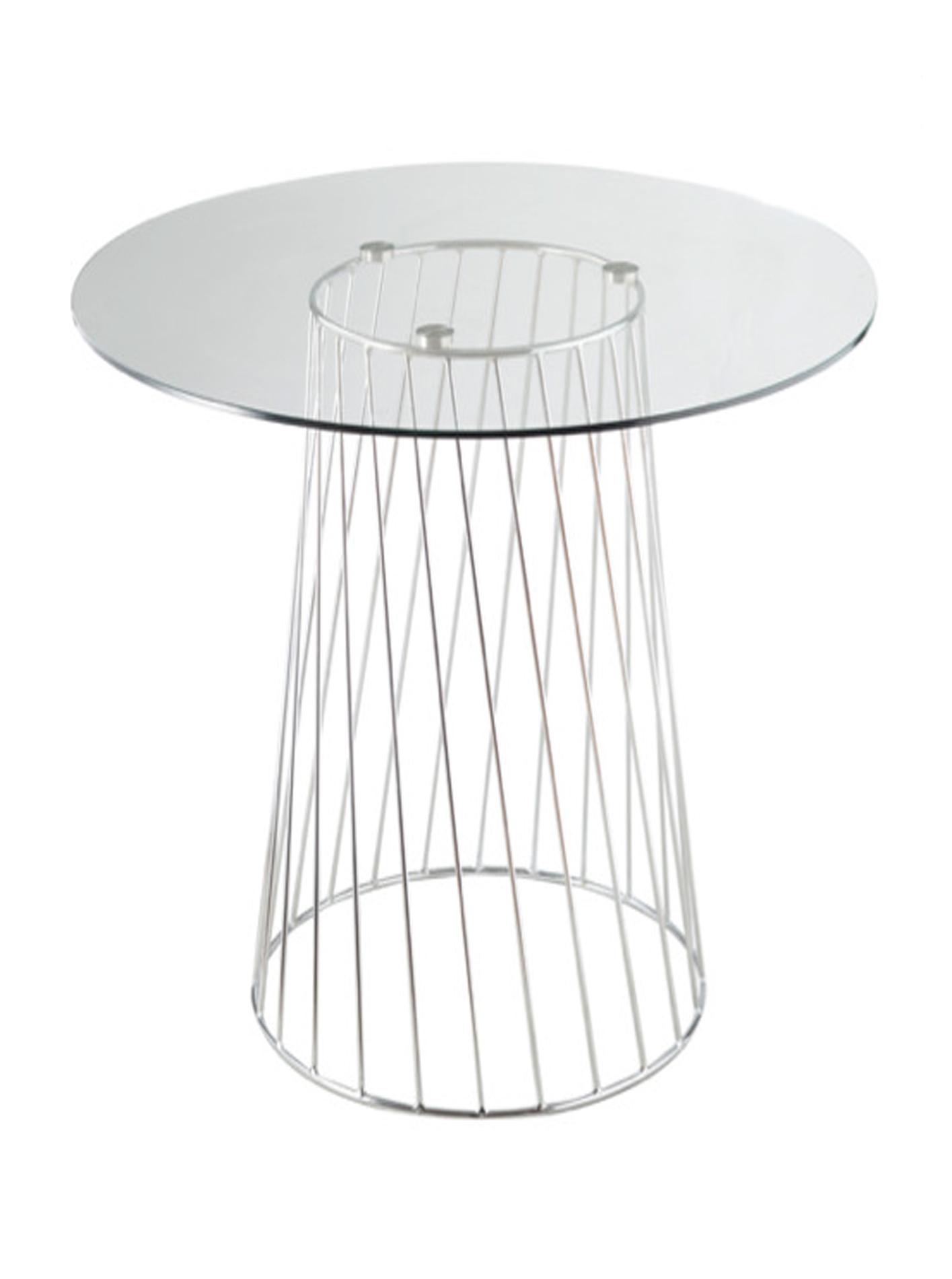 Mesa circular con estructura de metal en forma de cilindro y cubierta de vidrio. Es una mesa resistente y practica ya que su tamaño permite usarla en variados lug